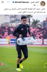 وكتب أحمد حسن نجم منتخب مصر السابق عبر حسابه الرسمي على موقع التواصل الإجتماعي “فيس بوك”: “تجدد آلام العضلة الأمامية للاعب المغربي أشرف بن شرقي بعد مشاركته في تدريبات الأهلي أمس.
