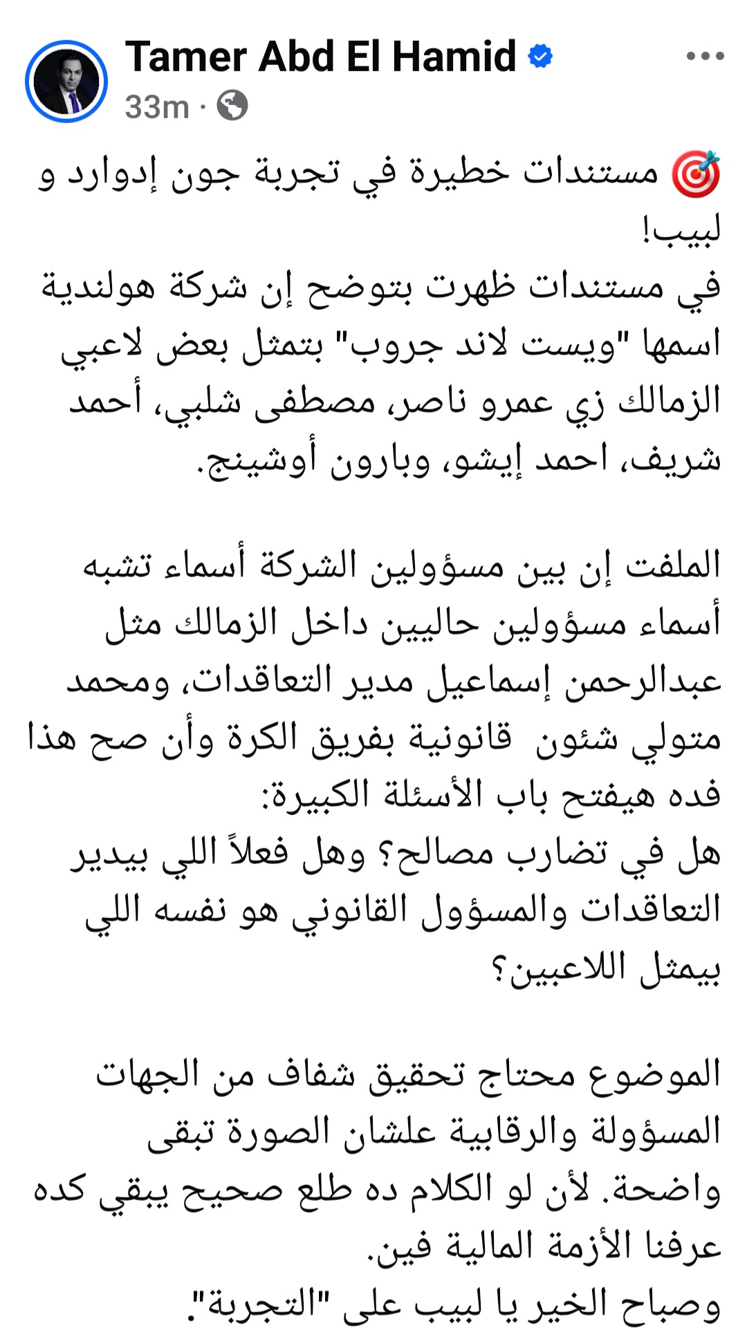 وطالب تامر عبدالحميد في ختام منشوره بضرورة فتح تحقيق شفاف من الجهات المسؤولة والرقابية لكشف حقيقة ما يجري، مؤكدا أن مثل هذه الوقائع إن صحت «تُفسر الكثير من الأزمات المالية التي يعيشها النادي»، قبل أن يختم منشوره بعبارة لافتة: