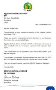وجه جياني إنفانتينو رئيس الاتحاد الدولي لكرة القدم، فيفا، والجنوب أفريقي باتريس موتسيبي رئيس الاتحاد الأفريقي لكرة القدم، بالتهنئة للمهندس هاني أبوريدة، عضو مجلس الفيفا والمكتب التنفيذي للكاف، بانتخابه هو وقائمته لقيادة اتحاد الكرة المصري خلال السنوات الأربعة المقبلة وحتى عام ٢٠٢٨.